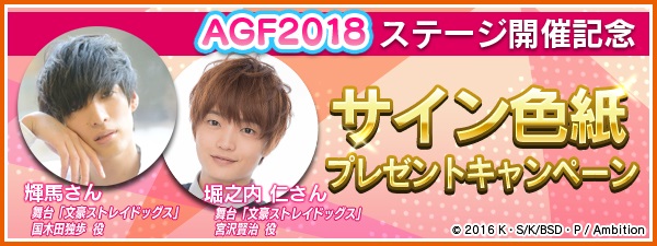 iOS/Android用アプリ『文豪ストレイドッグス 迷ヰ犬怪奇譚』にて、アニメイトガールズフェスティバル2018(AGF2018)でのスペシャルステージ開催を記念し、11月10日(土)より、ステージゲストの直筆サイン色紙が抽選で当たる“AGFステージ開催記念 サイン色紙プレゼントキャンペーン”が開催される。
