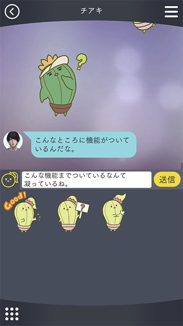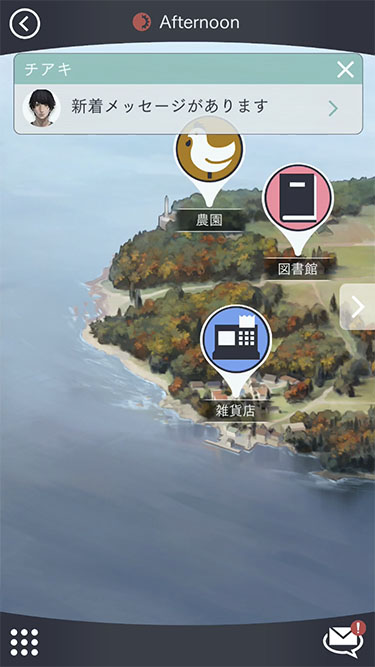 監視や島の散策などで入手した“話題”を使って、彼とメッセージのやりとりができる。メッセージを送ると、彼がリアルタイムで反応してくれる。こちらから送るだけではなく、思いがけないタイミングで、彼からメッセージが届くことも。そんなときでも、本作では、通知機能が あるので、見逃すことはない。さらに、スタンプ機能も登場。あなたの気持ちに合わせて使ってみよう(一部スタンプはアプリ内課金で入手できる)。