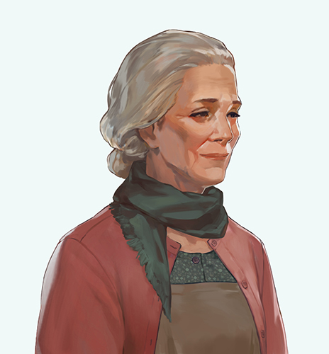 広い畑の手入れやニワトリの世話などを一手に引き受けているおばあさん。とても穏やかで親切な性格で、余った食材をおすそ分けしてくれる。野菜や植物などに精通していて、料理や食べ物、園芸に関する話題が多いようだ。