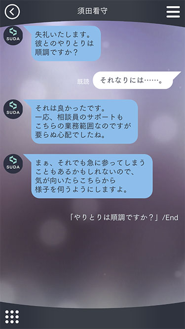これまでメッセージは彼のみとのコミュニケーションツールだったが、今作では須田看守と門司からメッセージが届くこともある。あなたから二人に送ることはできないが、彼らから届いたメッセージに返事することでコミュニケーションできる。チアキとのメッセージ中に、二人からメッセージが来た場合も通知が来るので、見落とすことはない。