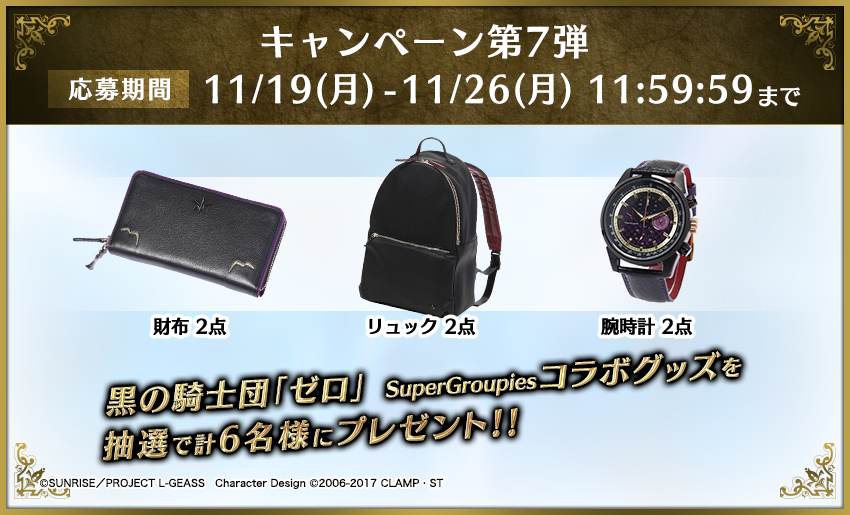“黒の騎士団”を導く“ゼロ”をイメージした腕時計、リュック、財布はどれもシックな仕上がり。高級感のあるブラックカラーに包まれた、SuperGroupies限定のアイテムとなっている。