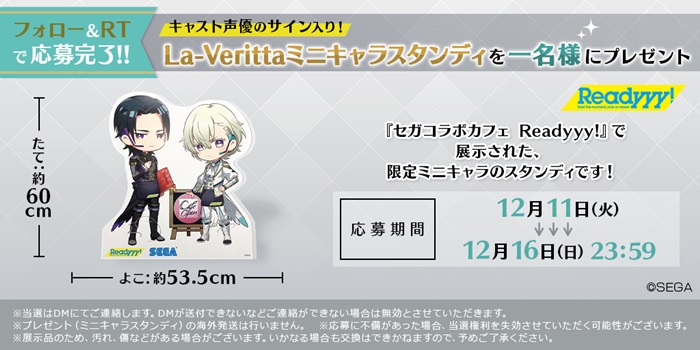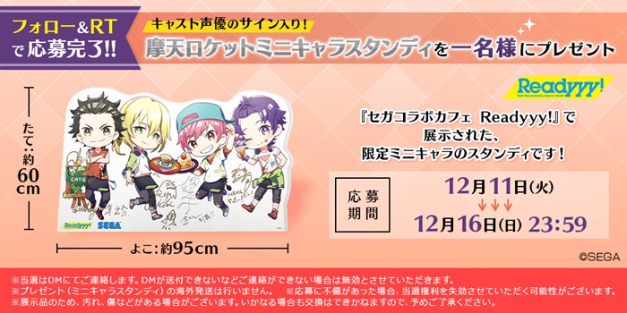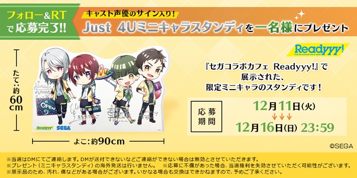 プレゼントの内容は、コラボカフェ店内に展示されていた各ユニットの“カフェ限定ミニキャラスタンディパネル”。ボイスを担当するキャストたちのサインが入ったレアな一品となる。『Readyyy!』公式 Twitter(@Readyyy_info)をフォローし、該当のツイートをリツイートすることで応募出来る。