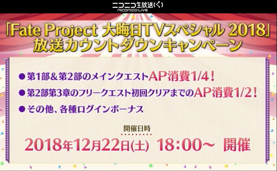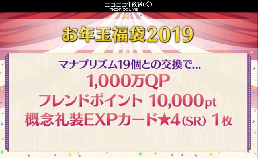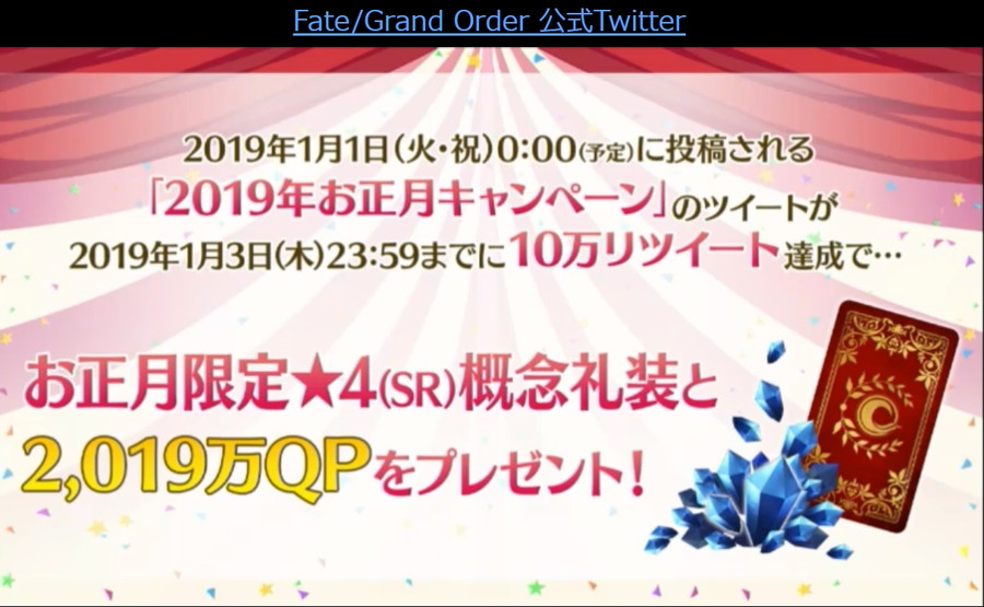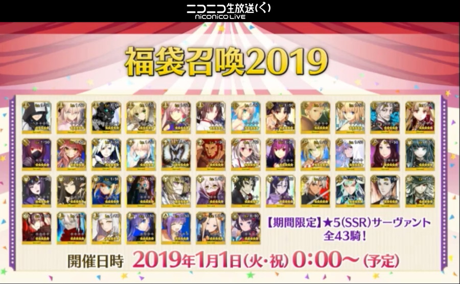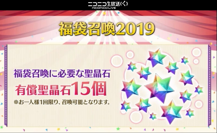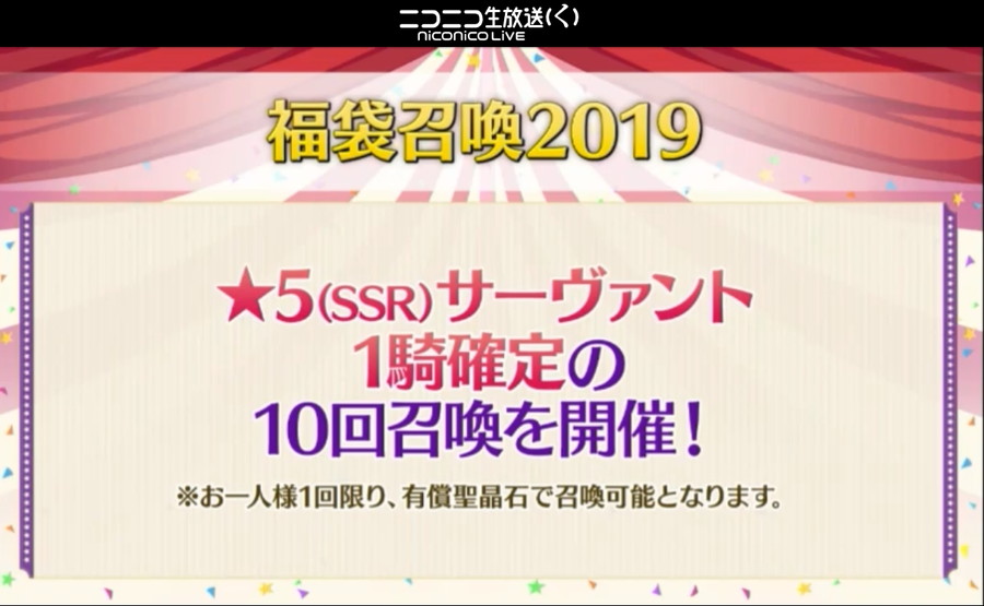 リツイートキャンペーンのほか、福袋召喚2019などの情報が公開された。2019年の福袋召喚は、期間限定サーヴァントのみが対象となる。