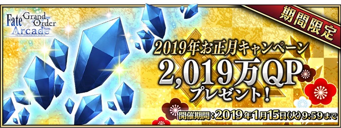 2019年1月1日(火・祝)AM10:00~1月15日(火)AM9:59の期間中、『FGO Arcade』ゲーム内にて“2019年お正月キャンペーン”が開催される。