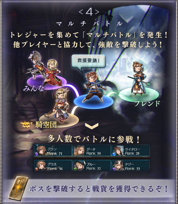 強力なボスは、マルチバトルで他のプレイヤーとの連携プレイで攻略! 気軽に参加できる最大30人参加のバトルで、一人では敵わないボスもラクラク撃破しよう。
