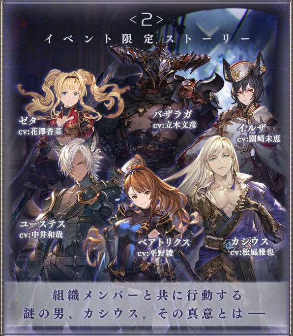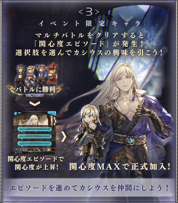 今回のイベントでは、“組織”関連のストーリーが描かれる。イベントストーリーのエンディングをクリア後に、イベントマルチバトルを3回クリアすると“関心度エピソード”が発生。関心度エピソードで選択肢を選ぶことで関心度を獲得することができ、関心度をMAXにするとキャラクター“カシウス”が仲間になる。