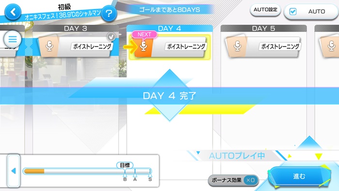 レッスンのマスでアイドルの能力値をアップさせ、最後のアイドル活動に挑もう。チャプター内のアイドル活動には“期待度”が4段階で設定されている。この“期待度”が高いほど、クリアした際に獲得できる“イベン Pt”は高くなる。