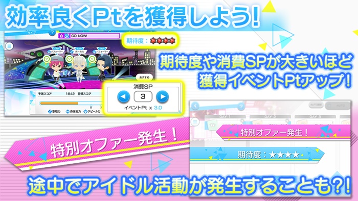 また、アイドル活動の消費SPは0~5まで選択することができ、消費SPに応じて獲得できる“イベントPt”もアップする。さらに、アイドル活動はチャプター中に確率で“特別オファー”として発生することも。“特別オファー”をクリアしても、“イベントPt”を獲得できる。