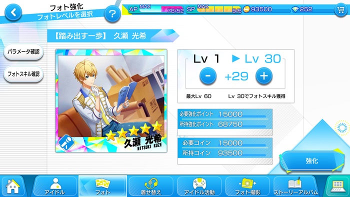 “メモリーズフォト”の強化は、育成の“強化チャプター”などで手に入る、強化ポイントとコインが必要。フォトレベルを上げると、パラメータが向上するほか、レベルに応じてフォトスキルを獲得することがある。イベントチャプターのレッスンで役立つスキルを持つフォトを積極的に強化するのもおすすめだ。