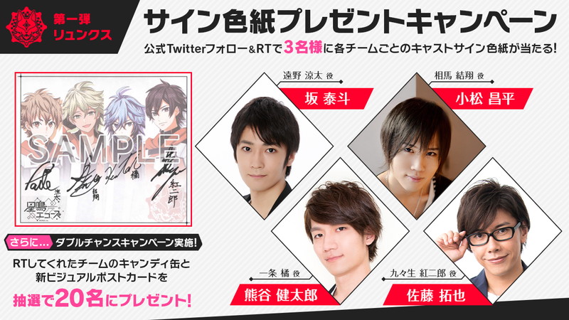 2月20日より実施される第1弾では、坂 泰斗さん(遠野涼太役)、小松昌平さん(相馬結翔役)、熊谷健太郎さん(一条 橘役)、佐藤拓也さん(九々生紅二郎役)のサインが“リュンクス”のイラスト入りの色紙でもらえる。