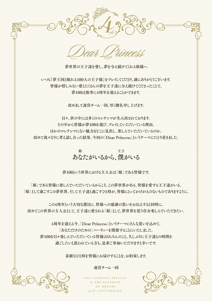 “Dear Princess”というテーマには、改めてこの世界の主人公として、王子達に愛される“姫”として、夢世界を思う存分楽しんでほしい、という願いが込められているという。また、本テーマ発表に伴い『夢100』アプリ内にて妖精石を最大40個獲得できるログインボーナスキャンペーンが開始。また、4周年特設サイトがオープンし姫様へのメッセージレターが公開された。