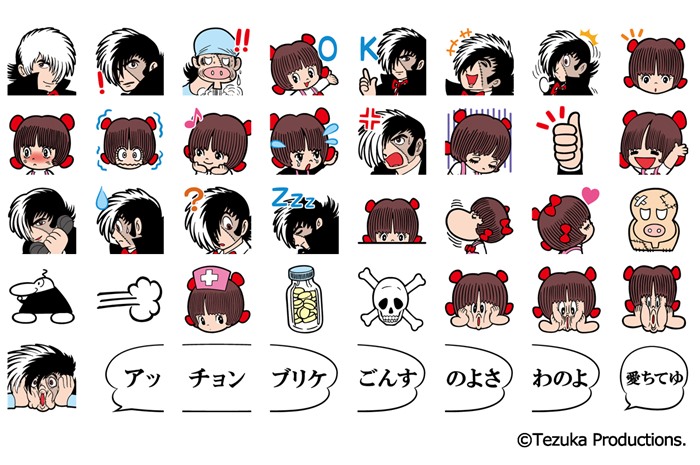 “ブラック・ジャック 絵文字”には、生誕90周年を迎えた手塚治虫による、医学ドラマ『ブラック・ジャック』のキャラクターであるクールなブラック・ジャックや、かわいらしいピノコの喜怒哀楽の表情を中心とした絵文字が全40種類収録。ピノコが驚いたときなどに用いる口癖の「アッチョンブリケ」の表情も多彩なバリエーションを収録しており、めずらしいブラック・ジャックによる「アッチョンブリケ」の絵文字も。また、「のよさ」、「愛ちてゆ」といったピノコの口調をトークに用いられるユニークな絵文字もあり、遊び心のあるトークが楽しめる。