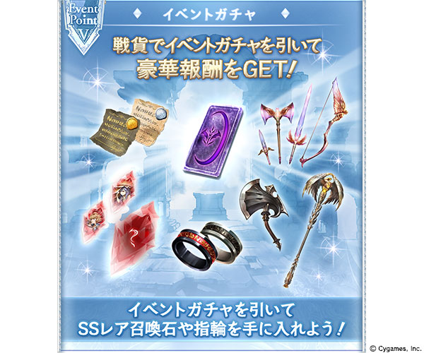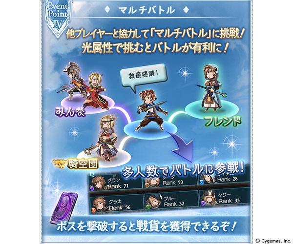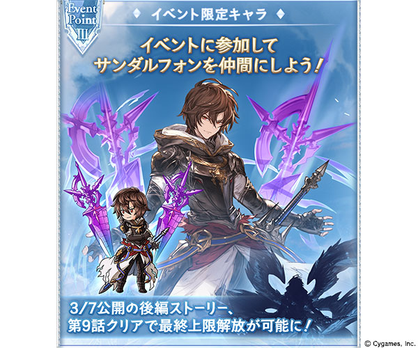 本イベントでは、イベントに参加すると、サンダルフォンが仲間になる。さらに3月7日公開の後編ストーリー、第9話クリアで最終上限解放が可能となっている。