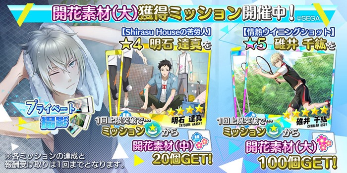 “★5【情熱ウイニングショット】碓井千紘”と“★4【Shirasu House の苦労人】明石達真”のメモリーズフォトを1回上限突破するとミッションクリアとなり、それぞれ“開花素材(大)”100個、開花素材(中)20個が手に入る。