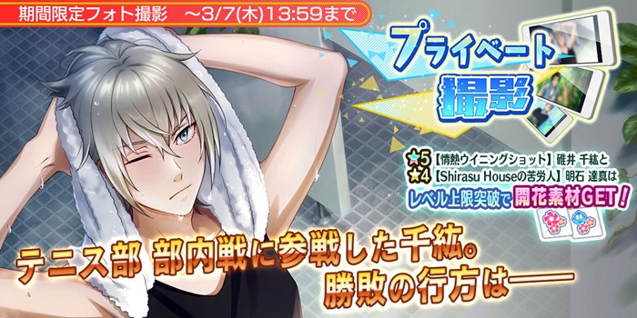 アイドル育成スマホゲーム『Readyyy!(レディ)』は、2月28日(木)より、RayGlanZ・碓井千紘(CV.小野将夢)、Just 4U・明石達真(CV.黒木陽人)、La-Veritta・清水弦心(CV.田中文哉)のプライベートな姿が垣間見える新メモリーズフォト撮影“プライベート撮影”が開催。また、ライブ配信サービス『SHOWROOM』にて、本日誕生日を迎える SP!CA・胡桃沢タクミ(CV.観世智顕)のバースデー生配信が実施される。