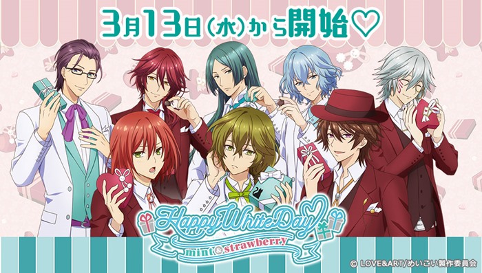 めいこいアプリ『ハヰカラデヱト』では、“めいこいロマン百貨店 HAPPY WHITE DAY ~mint&strawberry~”描きおろし衣装や、期間限定メッセージ、録りおろしボイスを獲得できるランクアップガチャ“HAPPY WHITE DAY ~mint&strawberry~”が開催。好男子から愛のお返しを存分に受け取るチャンス!