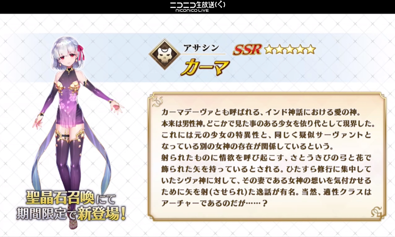 新規サーヴァントとして星5アサシンのカーマが公開! また、獲得可能なコマンドコード、新機能などが公開された。イベントは3月27日18時より開催予定だ。