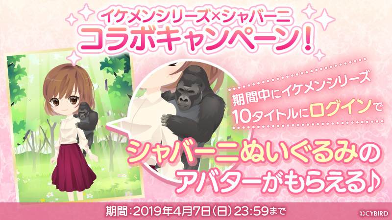 累計2,000万ダウンロードを突破した人間界で大人気の恋愛ゲーム『イケメンシリーズ』とのコラボキャンペーンが実施。4月1日0:00~7日23:59の期間中にイケメンシリーズ10タイトルにログインすると、“シャバーニぬいぐるみ”のアバターがもらえる。