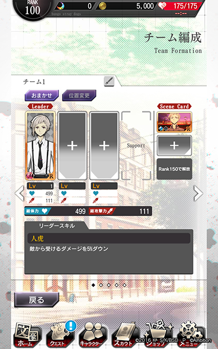 シーンカードとは、TVアニメ『文豪ストレイドッグス』の名場面をカードにしたもの。チームに編成することによって、チーム全体の能力を引き上げることができる。また、集めたシーンカードはゲーム内“図鑑”にていつでも閲覧することができる。