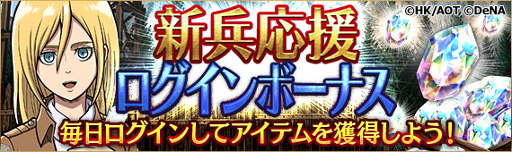 本キャンペーンでは、★4 訓練兵団 エレン・イェーガー(CV.梶 裕貴)や★3 訓練兵団 アルミン・アルレルト(CV.井上麻里奈)など対象のキャラクターと兵器を強化し、特定の条件を達成すると水晶が入手できる。なお、対象のキャラクターと兵器は、チュートリアルをクリアすると手に入れることができる。また、すべての条件を達成すると、最大70個の水晶が獲得できる。なお、水晶はガチャを引けるほか、行動力の回復などに使用できる。