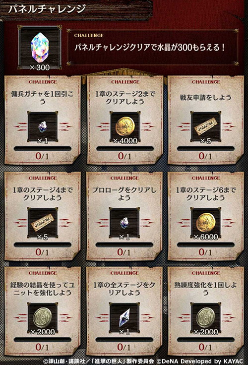 このパネルチャレンジでは、パネルに9つのチャレンジが記載されており、各チャレンジを達成すると、傭兵ガチャを引くことができる傭兵ポイントや、キャラクターを強化できる経験の結晶などの報酬を獲得できる。また、全チャレンジを達成すると、水晶300個を手に入れることが可能。