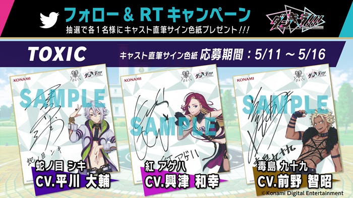 第5弾は、ミステリアスなヴォーグダンスを得意とする“TOXIC”(トキシック)の、蛇ノ目シキを演じる平川 大輔さん、紅 アゲハを演じる興津 和幸さん、毒島九十九を演じる前野 智昭さんの直筆サイン色紙が当たるチャンス!
