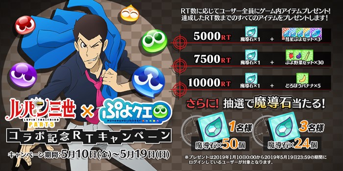 今回のコラボレーションでは、“[★6]ルパン三世”をはじめ、ぷよクエオリジナルイラストのコラボキャラクターが登場。さらに、コラボ開催を記念して、『ぷよクエ』公式Twitterにて、リツイート数に応じてゲーム内アイテムがもらえる“ルパン三世 PART5コラボ記念RTキャンペーン”が実施される。
