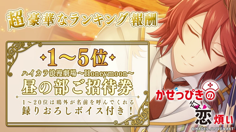 また、今回のイベントでは、ランキング上位のユーザーが、6月22日に舞浜アンフィシアターにて開催となる『明治東亰恋伽 ハイカラ浪漫劇場 ~ Honeymoon~』へ特別招待される。