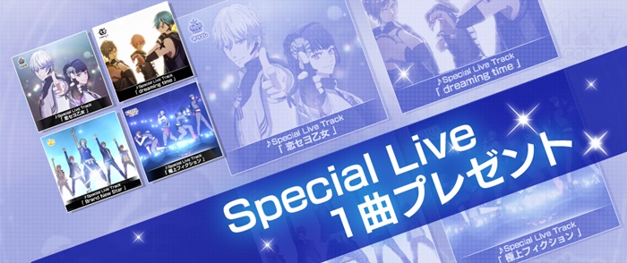 新しく実装された“スペシャルライブモード”に登場する4曲から全員に1曲配布。好きなユニットの動画を背景に、特別なライブを楽しもう♪