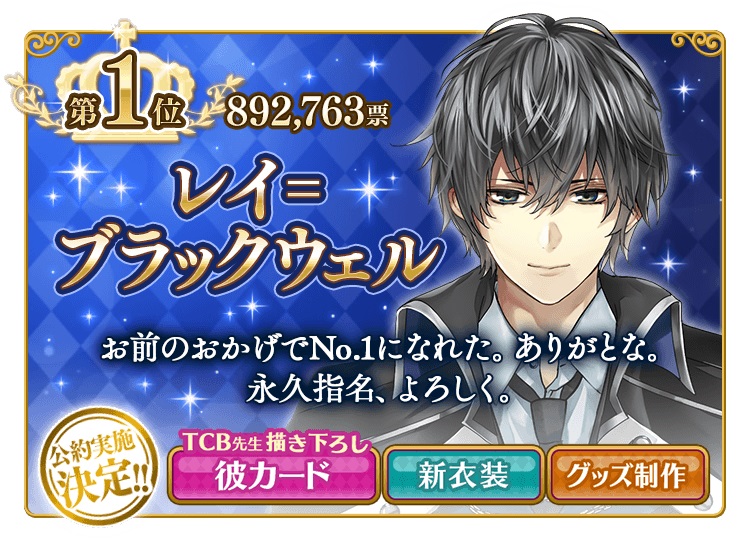総投票数 6,688,558票のうち、栄えある1位を獲得したのは、投票数892,763票を獲得した、黒のキング レイ=ブラックウェル(CV:下野 紘)が、昨年、一昨年に引き続き見事3連覇を果たし、“小悪魔な彼からもてあそばれ部門”でも1位に輝いた。
