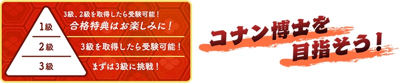 名探偵コナン検定は、株式会社小学館/株式会社CYBIRDが主催する、あなたのコナン知識量を測るための公式の検定。名探偵コナンのコミックスにまつわる問題を階級別(1級~3級)に出題し、正答率に応じて青山先生描き下ろしイラスト入りの”公式認定書”が発行される(2019年10月は3級のみの開催になります。)特典は公式認定書以外にも限定壁紙など目白押しだ。