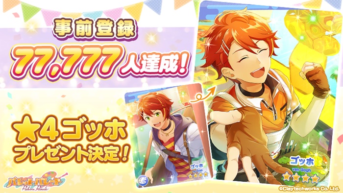 事前登録数が77,777人を突破し!登録者数に応じた報酬がもらえる事前登録キャンペーンの報酬の事前登録限定“★4ゴッホ”の配布が決定した。これに伴い、ゲームリリース後、★3以上確定チケットの配布が確定した他、ジュエル1,500個(ガチャ5回分)も確定した。