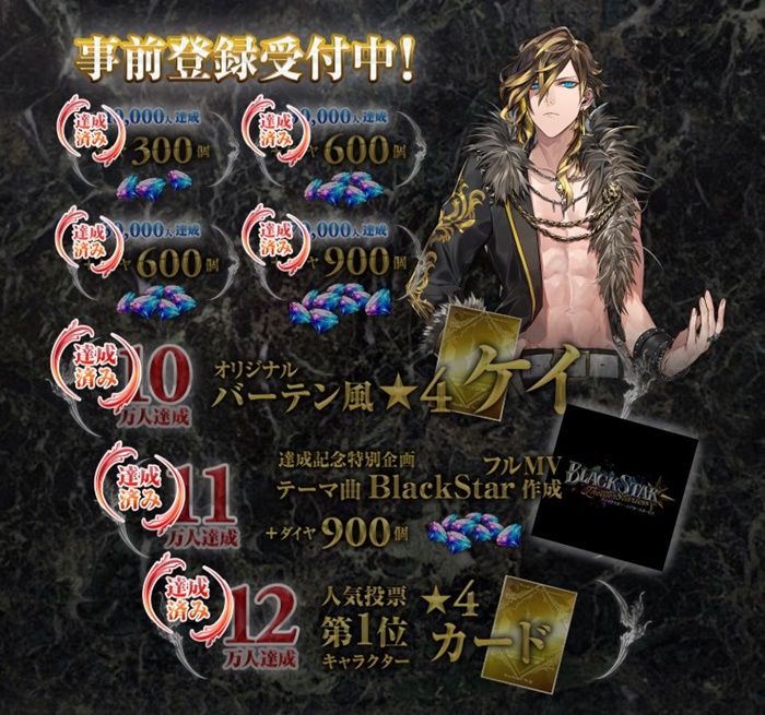 2019年7月より開始した事前登録は、リリース前日までに13万人を突破。報酬は“ダイヤ3300個” 、“オリジナルバーテン風★4「ケイ」カード”、“人気投票第1位キャラクター★4カード”。チュートリアル完了後、プレゼントボックスより受け取ろう。