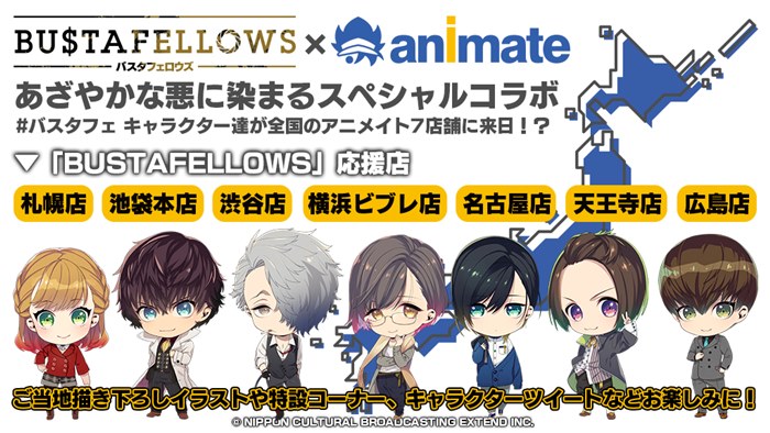 アニメイト全国7店舗があざやかな悪に染まる!『BUSTAFELLOWS』のキャラクター達がアニメイト #バスタフェ 応援店に遊びに来る!