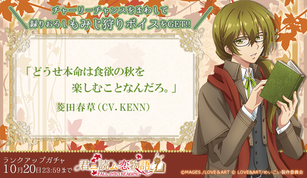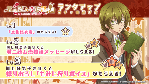 ※LV.2 の限定メッセージは読書や秋の味覚を題材にしたムードが漂うミニシナリオ。LV.3の録りおろしボイスは、好男子からのもみじ狩りのお誘い。