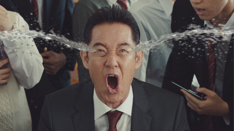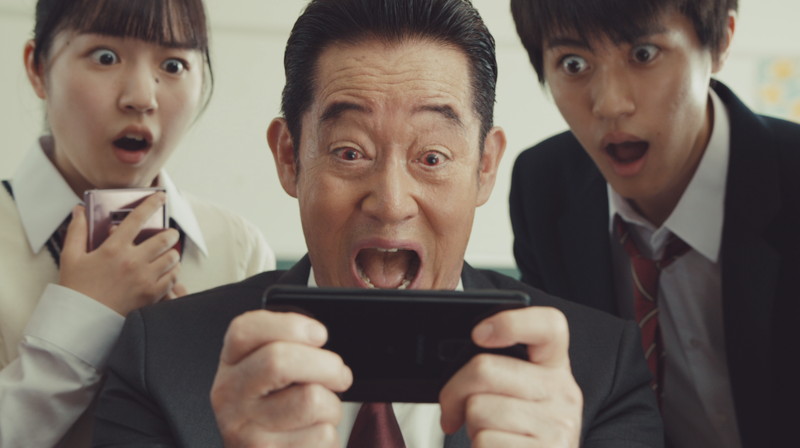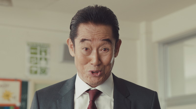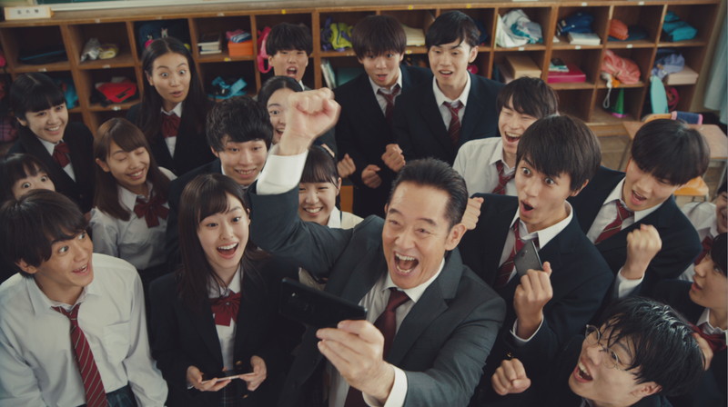 放課後の教室で、教師を演じる山下真司さんが「早く帰れよー」と生徒たちに帰宅を促す場面からCMはスタート。『デレステ』に夢中になりなかなか帰らない生徒たちに呆れつつ教室から出ようとすると、山下さんは廊下で待ち受けた謎の人物にギアスをかけられ、『デレステ』を愛してやまない「熱血デレステ先生」に変身してしまう。