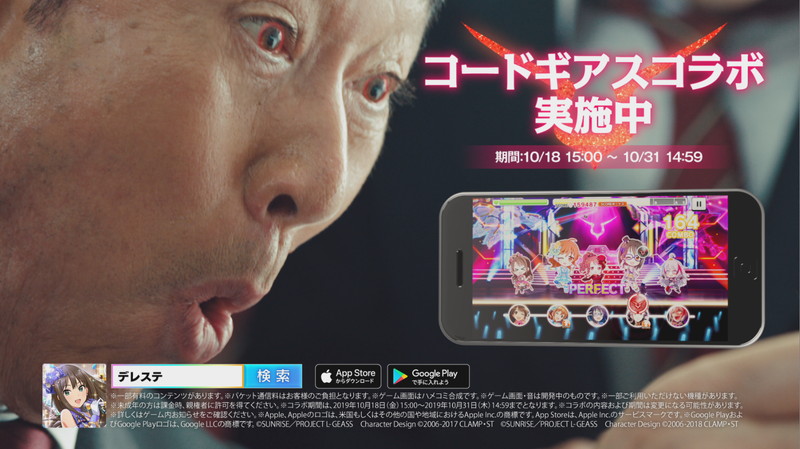 10月18日よりスマートフォン向けゲームアプリケーション『アイドルマスター シンデレラガールズ スターライトステージ』において『コードギアス』シリーズとのコラボキャンペーンが実施。俳優・山下真司さんやコードギアスでルルーシュ・ヴィ・ブリタニア役を演じる福山 潤さんが起用された新CMが全国で放送される。