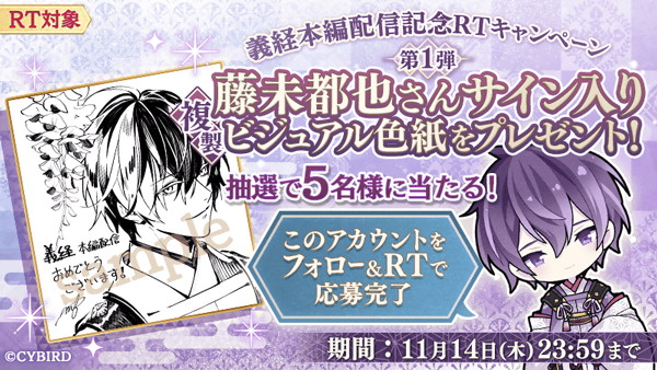 イケメン源氏伝公式 Twitter(@ikemen_genjiden)をフォローのうえ、10月31日に投稿される該当ツイートをRTした中から抽選で5名に、キャラクターデザインを手掛ける藤未都也さんのサイン入り複製ビジュアル色紙が当たる。