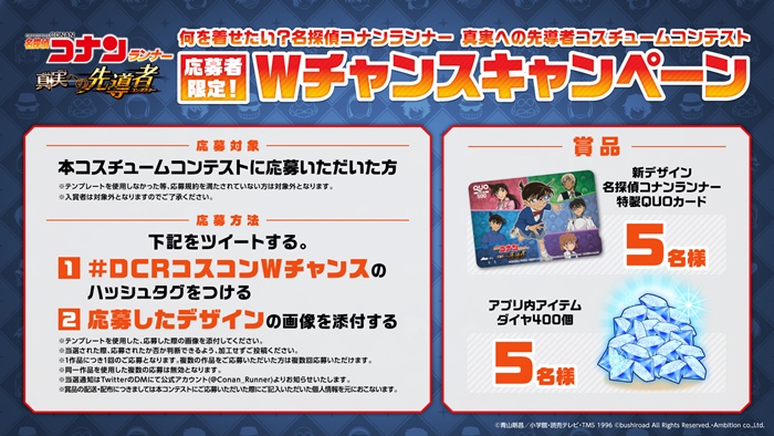 “何を着せたい? 名探偵コナンランナー 真実への先導者 コスチュームコンテスト”の応募者限定で“Wチャンスキャンペーン”を開催。コナンランナー特製QUOカードやダイヤ400個が各5名に当たるキャンペーンとなっている。