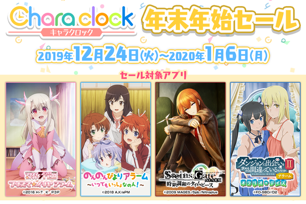 『Fate』や『ダンジョンに出会いを求めるのは間違っているだろうか』、『STEINS;GATE』などのキャラクターと目覚ましアプリを合わせたブランド「Chara clock」が、年末年始アプリ大特価セールを開催中だ。