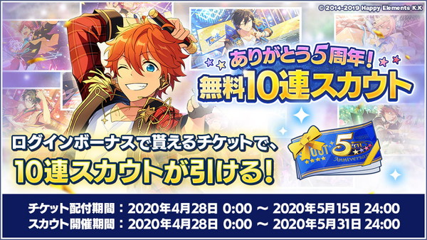 4/28から5/15までのキャンペーン期間中に一度でもログインすると、期間内で初めてログインした日には「ありがとう5周年!10連スカウトチケット」がもらえます。