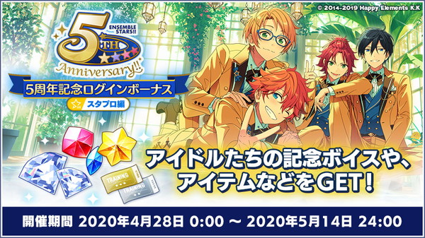 4/28から5/14にかけて実施するログインボーナスです。スタプロ所属のアイドルたちからの5周年記念ボイスのほか、ダイヤや育成アイテムなどを毎日日替わりでご用意しています。