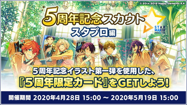 4/28~5/19の期間限定で、スタプロ所属のアイドルのみが登場する5周年記念スカウト第1弾を開催。5周年記念イラストによる「5周年限定カード」が出やすいスカウトとなっています。10連スカウトは、5周年限定カードが 2 枚以上確定!