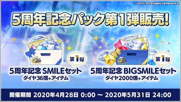 5周年を記念して、スマイル間違いなしのお得なパックを発売! おまけダイヤが大幅に増量され、さらに育成素材もセットになった、お一人様につき一回のみ購入可能な限定セットです。