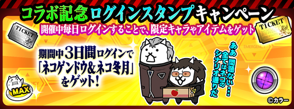 コラボ期間中にログインすれば、1日1個ずつスタンプをプレゼント。3日間ログインでコラボ限定EXキャラクター「ネコゲンドウ&ネコ冬月」が入手できる。