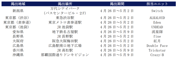 本日4月26日からは以下地域にて掲出中。4月27日以降、北海道、宮城県、福岡県、兵庫県にも順次掲出予定。近くの地域を担当しているESアイドルはどのユニットか、お楽しみに!