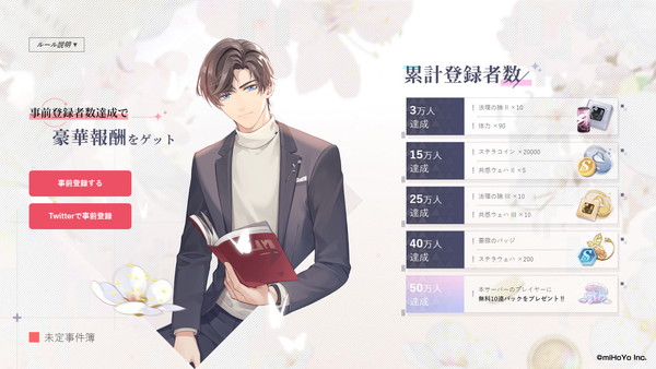 6月17日(木)より、 『未定事件簿』の事前登録が公式サイト、 Twitter、 App Store、 Google Playの各アプリストア、 及び予約トップ10にて絶賛受付中となっております。 事前登録者数に応じて正式サービス後に配布する特典が追加されていく事前登録キャンペーンを実施しておりますので、 奮ってご参加ください。
