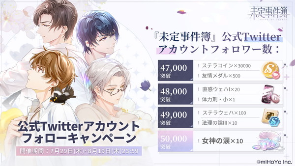 『未定事件簿』公式Twitterのアカウントフォロワー数に応じて、豪華報酬をプレゼント。ぜひこの機会に、『未定事件簿』をプレイして、フォロワー数に応じた豪華報酬を獲得しよう! また、既に本作公式Twitterアカウントをフォローしていただいている方も、『未定事件簿』の魅力を広め、豪華報酬を獲得しよう。詳細は公式サイトもしくは、公式Twitterアカウントをチェックして。