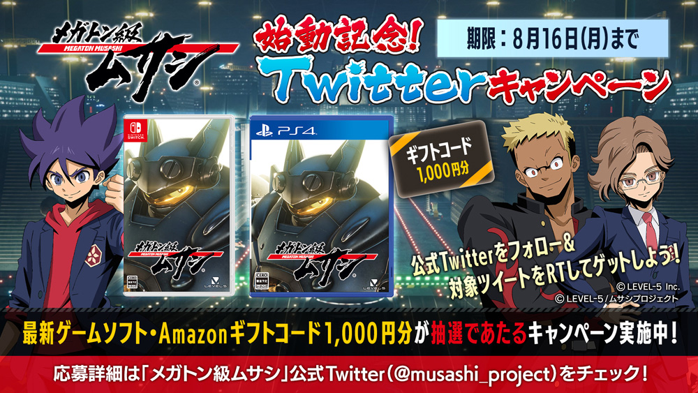 本日8月6日(金)より、2つのTwitterキャンペーンを実施中! 「メガトン級ムサシ」公式Twitterをフォロー&対象ツイートをRTして豪華プレゼントをゲットしよう! 詳細は公式Twitterをチェック!