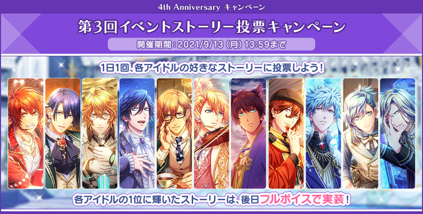 ・「うたの☆プリンスさまっ♪ Shining Live 4th Anniversary」特設サイトのイベントストーリー投票キャンペーンバナーからご投票ください。